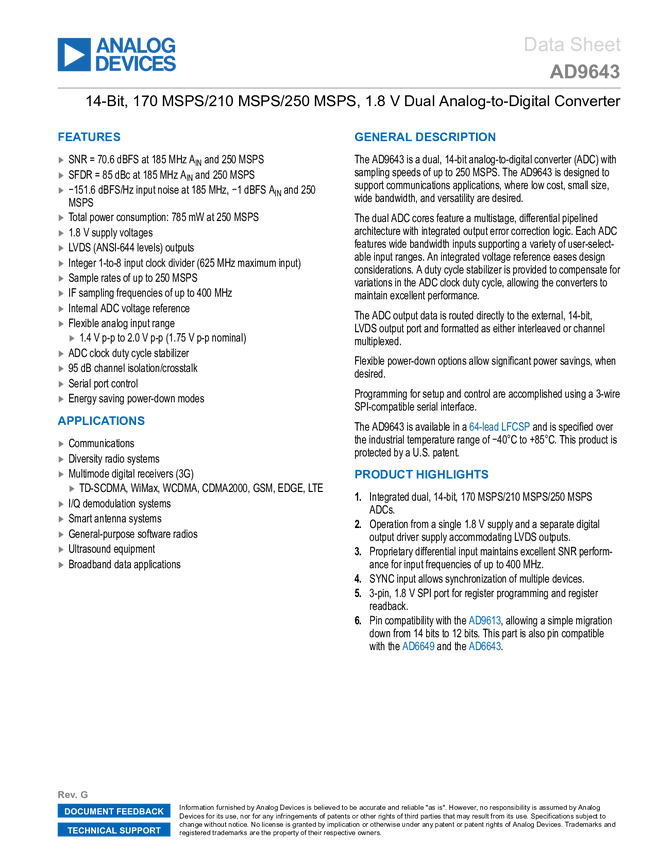 AD9643 14-Bit, 170 MSPS/210 MSPS/250 MSPS, 1.8 V Dual Analog-to-Digital Converter...