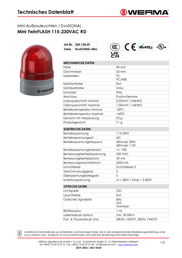 260.120.60 Sygnalizator świetlny Werma Signaltechnik Mini TwinFLASH 115-230VAC RD 2...