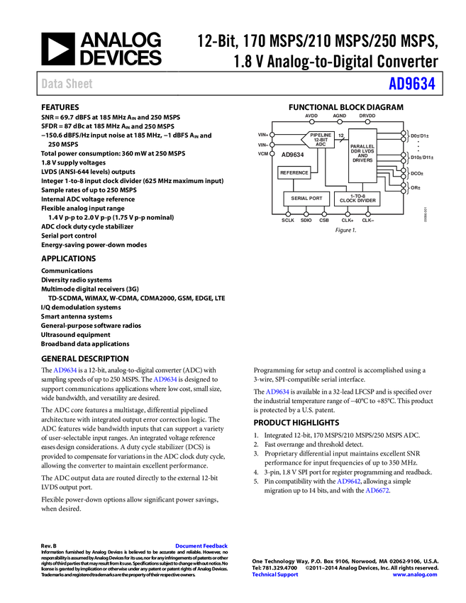 AD9634 12-Bit, 170 MSPS/210 MSPS/250 MSPS, 1.8 V Analog-to-Digital Converter