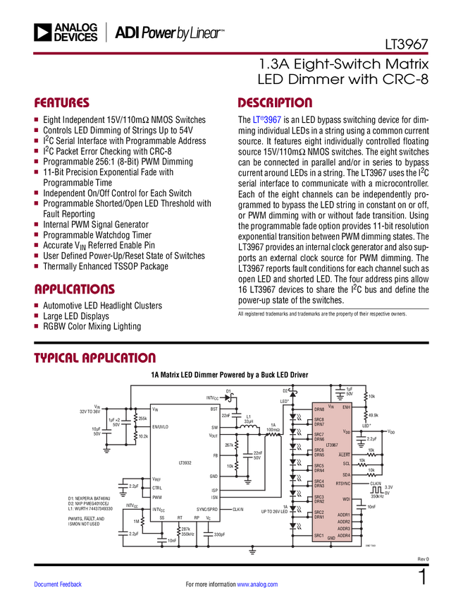 LT3967 1.3A Eight-Switch Matrix LED Dimmer with CRC-8