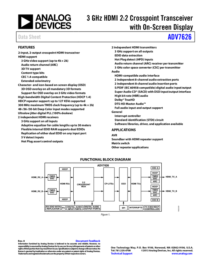 ADV7626 3GH HDMI 2:2 cross point Transceiver with On-Screen Display