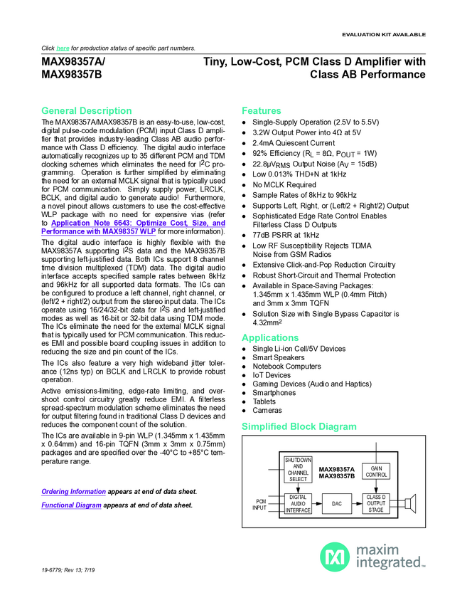 MAX98357B Tiny, Low-Cost, PCM Class D Amplifier with Class AB Performance