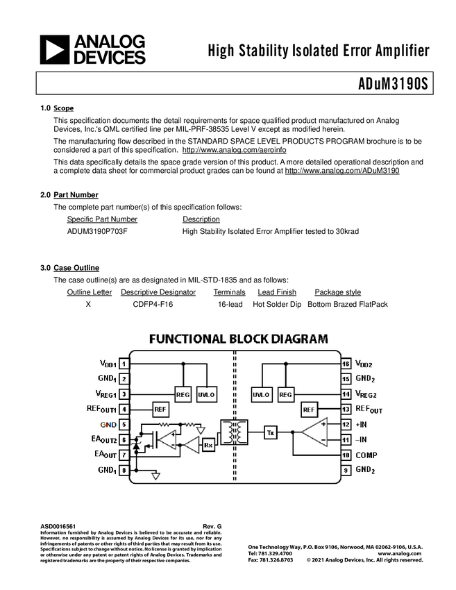 ADuM3190S Aerospace High Stability Isolated Error Amplifier