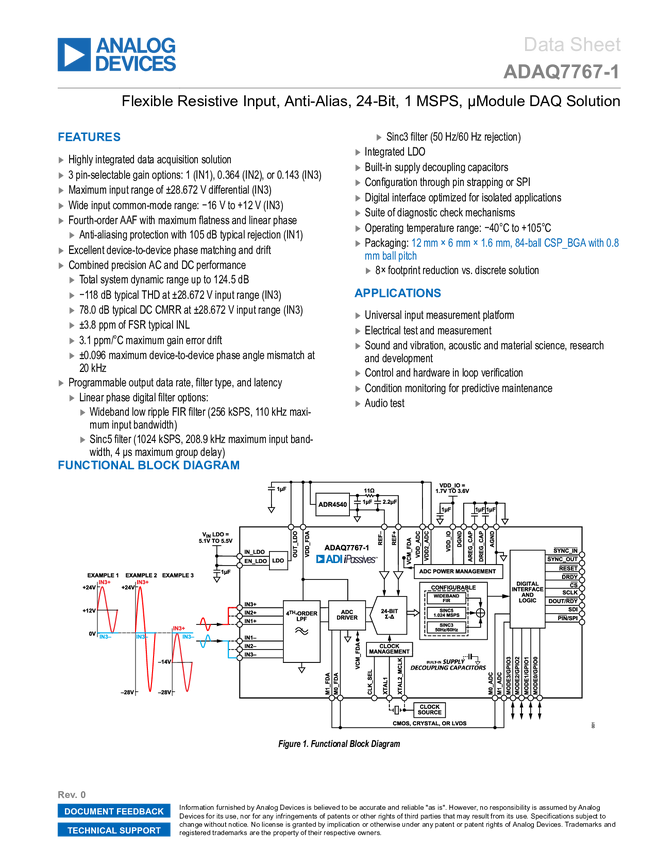 ADAQ7767-1 Flexible Resistive Input, Anti-Alias, 24-Bit, 1 MSPS, μModule DAQ Solution