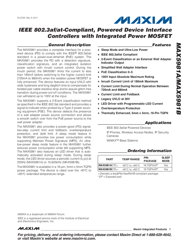 MAX5981B IEEE 802.3af/at-Compliant, Powered Device Interface Controllers with Integr...