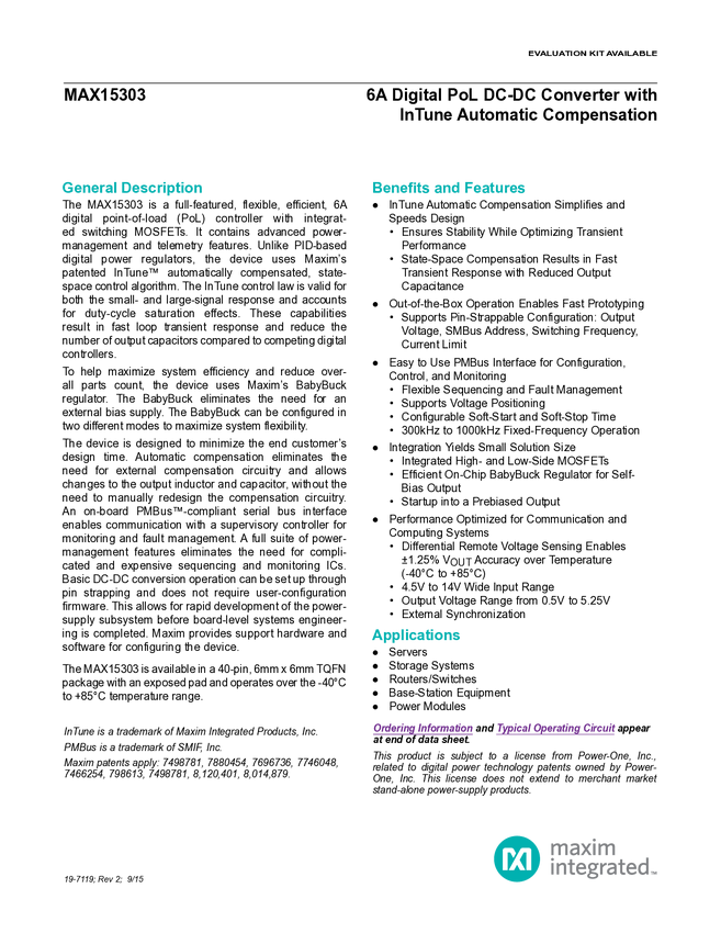MAX15303 6A Digital PoL DC-DC Converter with InTune Automatic Compensation
