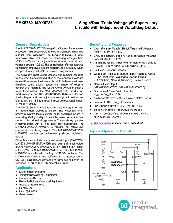 MAX6735 Single-/Dual-/Triple-Voltage µP Supervisory Circuits with Independent Watch...