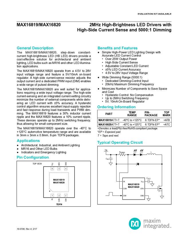 MAX16819 2MHz High-Brightness LED Drivers with High-Side Current Sense and 5000:1 Di...