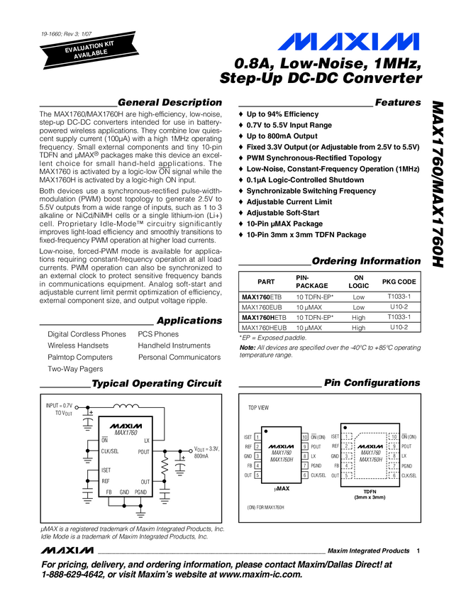 MAX1760H 0.8A, Low-Noise, 1MHz, Step-Up DC-DC Converter
