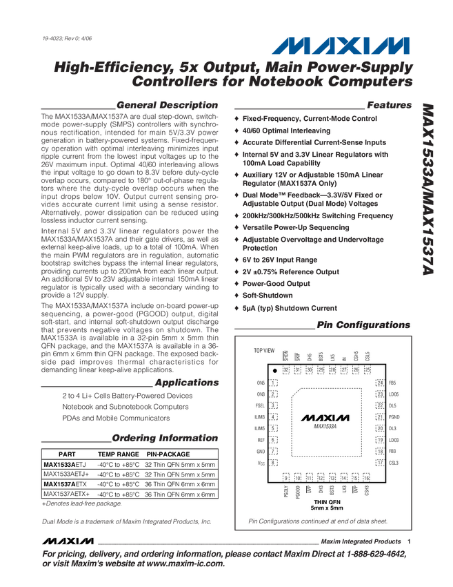 MAX1533A High-Efficiency, 5x Output, Main Power-Supply Controllers for Notebook Comp...