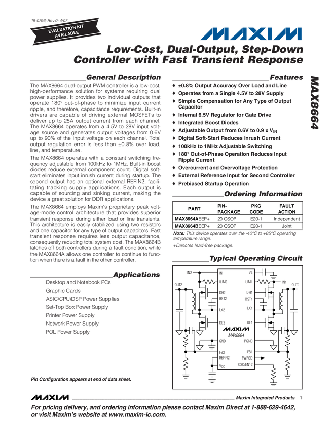 MAX8664 Low-Cost, Dual-Output, Step-Down Controller with Fast Transient Response