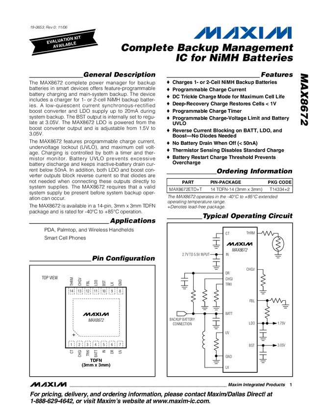 MAX8672 Complete Backup Management IC for NiMH Batteries