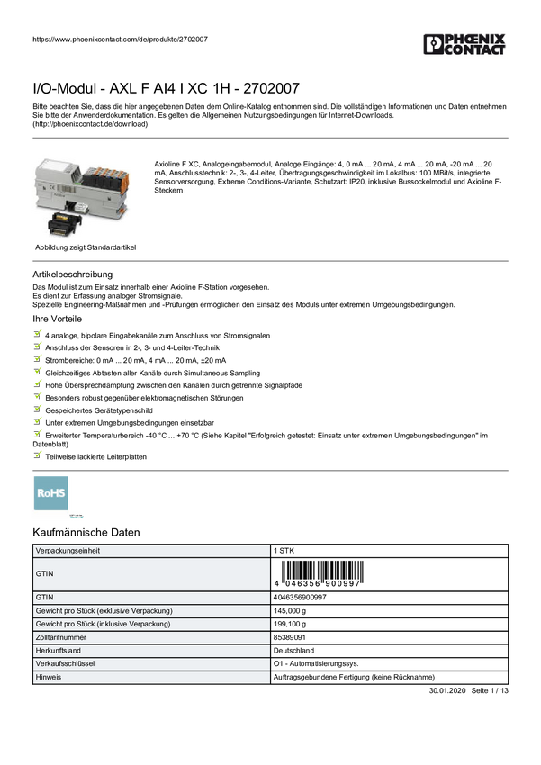 2702007 Phoenix Contact AXL F AI4 I XC 1H 2702007 Moduł I/O 5 V/DC