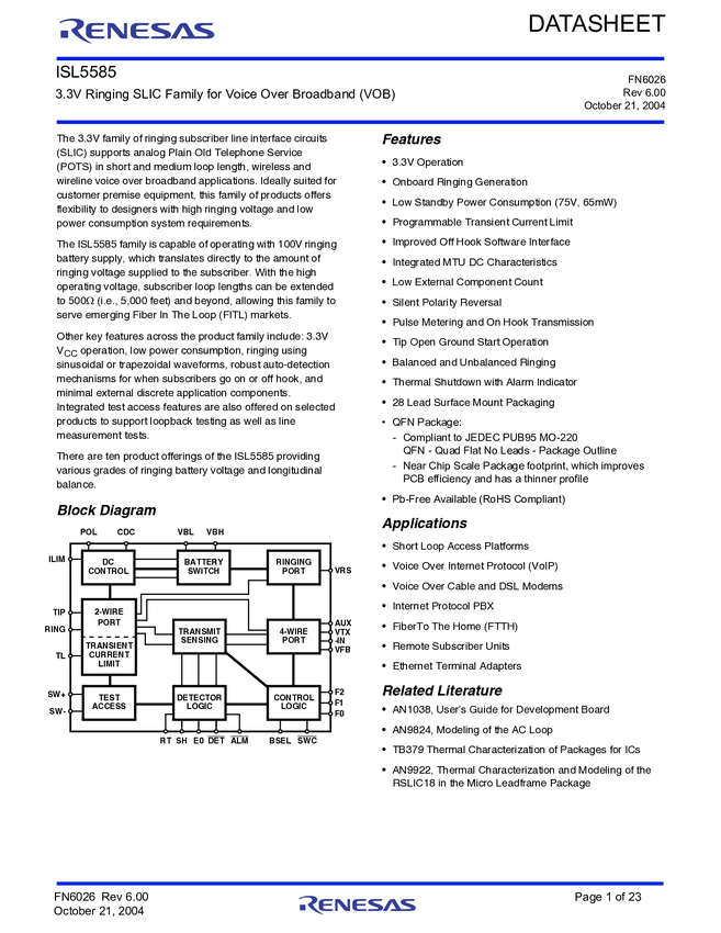 ISL5585 3.3 Volt Ringing SLIC Family for Voice Over Broadband (VOB)