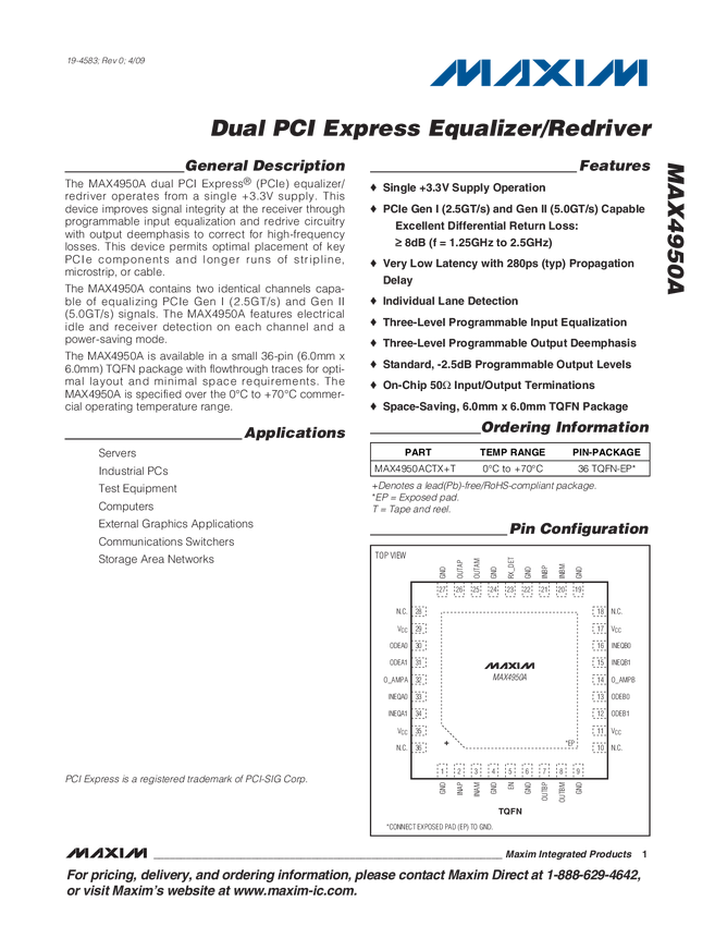 MAX4950A Dual PCI Express Equalizer/Redriver