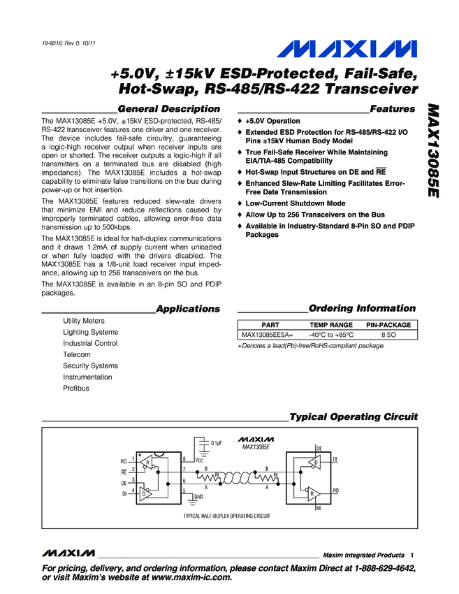 MAX13085E +5.0V, ±15kV ESD-Protected, Fail-Safe, Hot-Swap, RS-485/RS-422 Transceiver