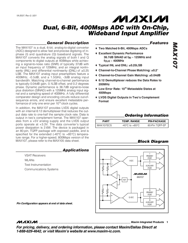 MAX107 Dual, 6-Bit, 400Msps ADC with On-Chip, Wideband Input Amplifier