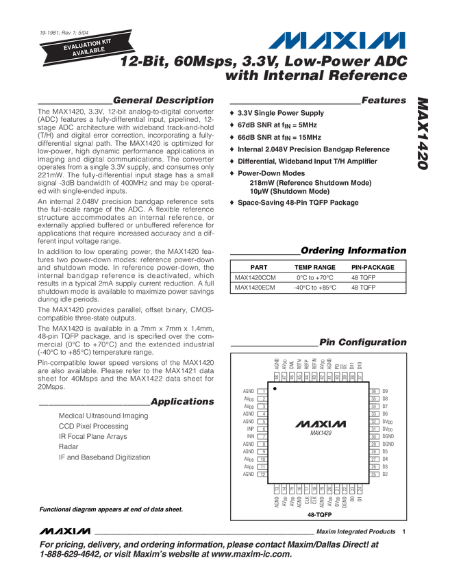 MAX1420 12-Bit, 60Msps, +3.3V, Low-Power ADC with Internal Reference