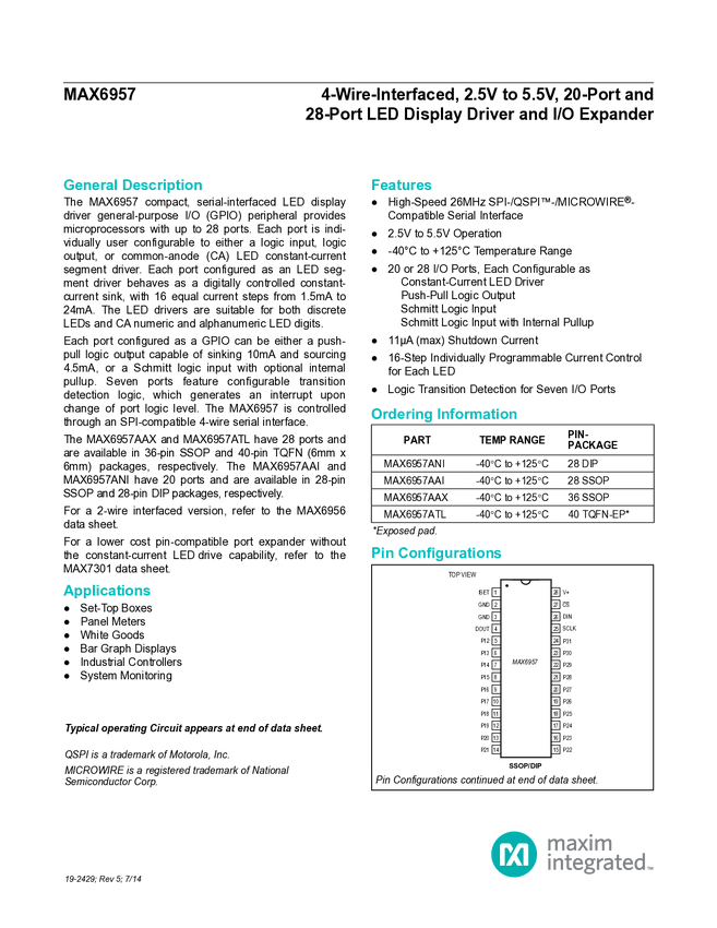 MAX6957 4-Wire-Interfaced, 2.5V to 5.5V, 20-Port and 28-Port LED Display Driver and...