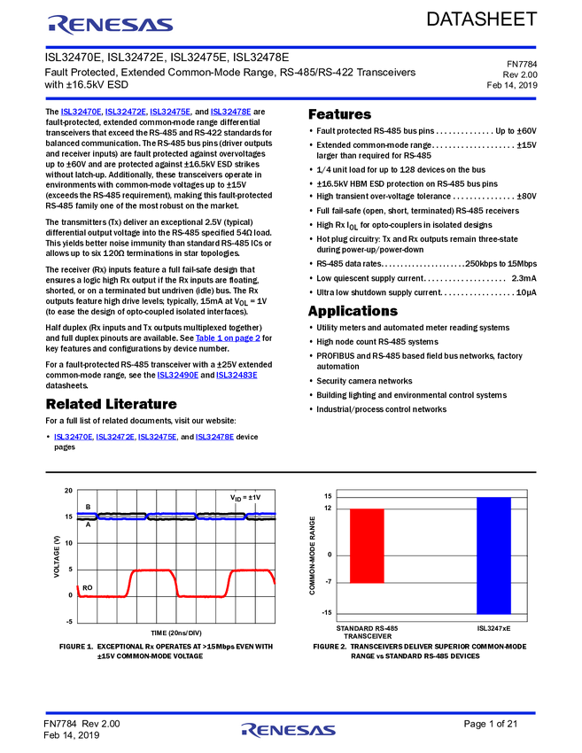 ISL32472E Fault Protected, Extended Common Mode Range, RS-485/RS-422 Transceivers wit...
