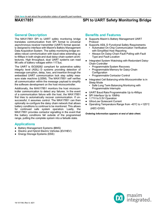 MAX17851 SPI to UART Safety Monitoring Bridge