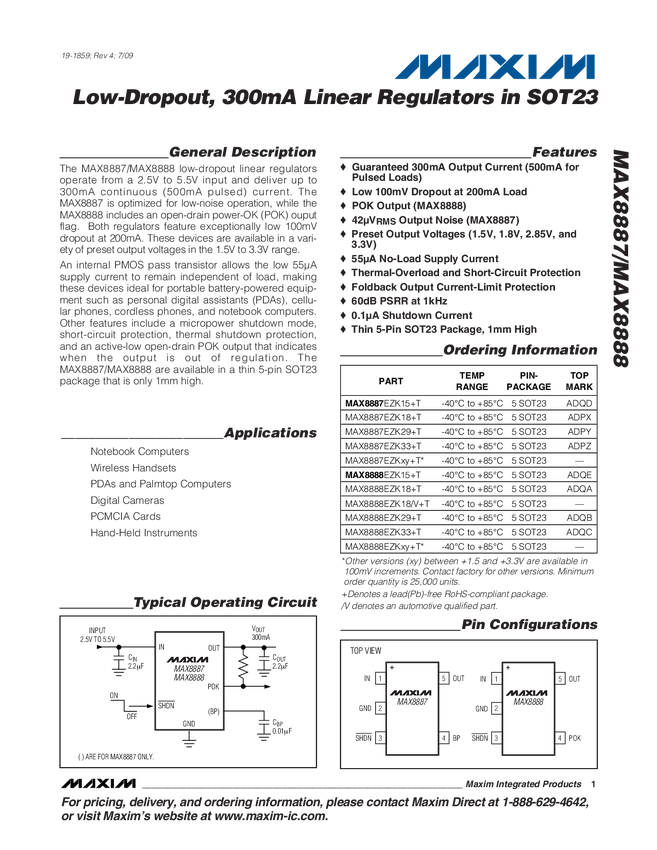 MAX8887 Low-Dropout, 300mA Linear Regulators in SOT23