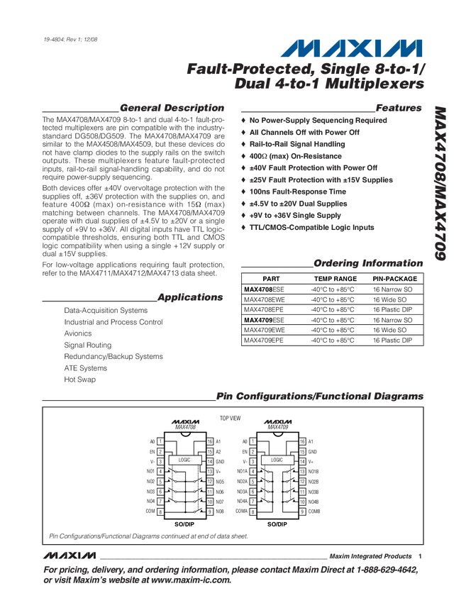 MAX4708 Fault-Protected, Single 8-to-1/Dual 4-to-1 Multiplexers