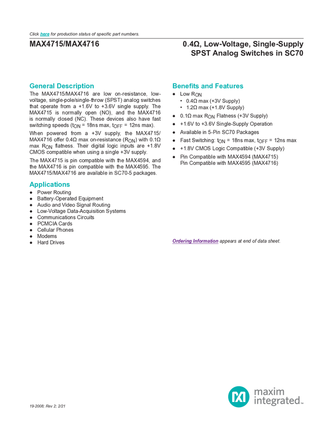 MAX4715 0.4Ω, Low-Voltage, Single-Supply SPST Analog Switches in SC70