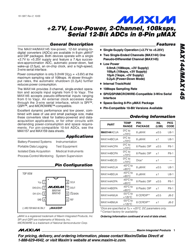 MAX145 +2.7V, Low-Power, 2-Channel, 108ksps, Serial 12-Bit ADCs in 8-Pin µMAX