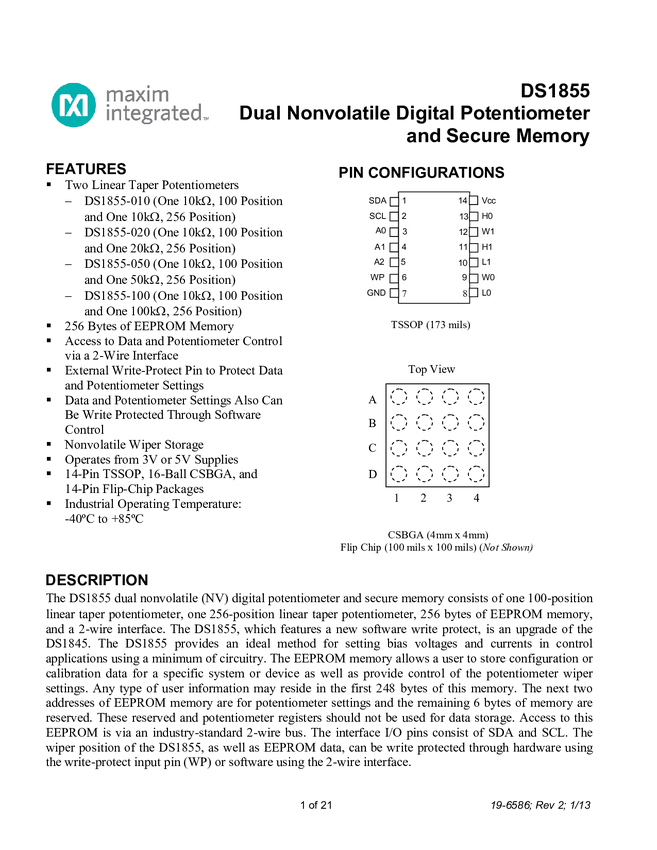 DS1855 Dual Nonvolatile Digital Potentiometer and Secure Memory