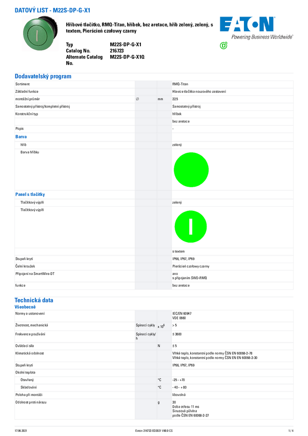 Eaton 216723 M22S-DP-G-X1 Przycisk grzybkowy zielony 1 szt.