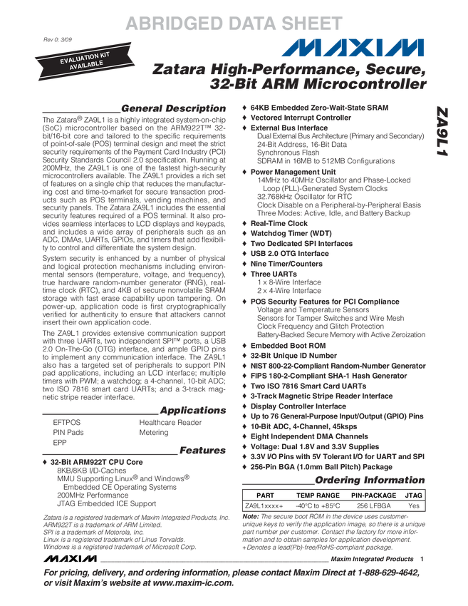 ZA9L1 DeepCover Secure Microcontroller with ARM922T Processor Core