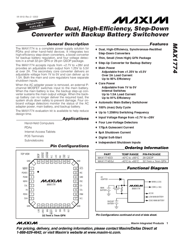 MAX1774 Dual, High-Efficiency, Step-Down Converter with Backup Battery Switchover