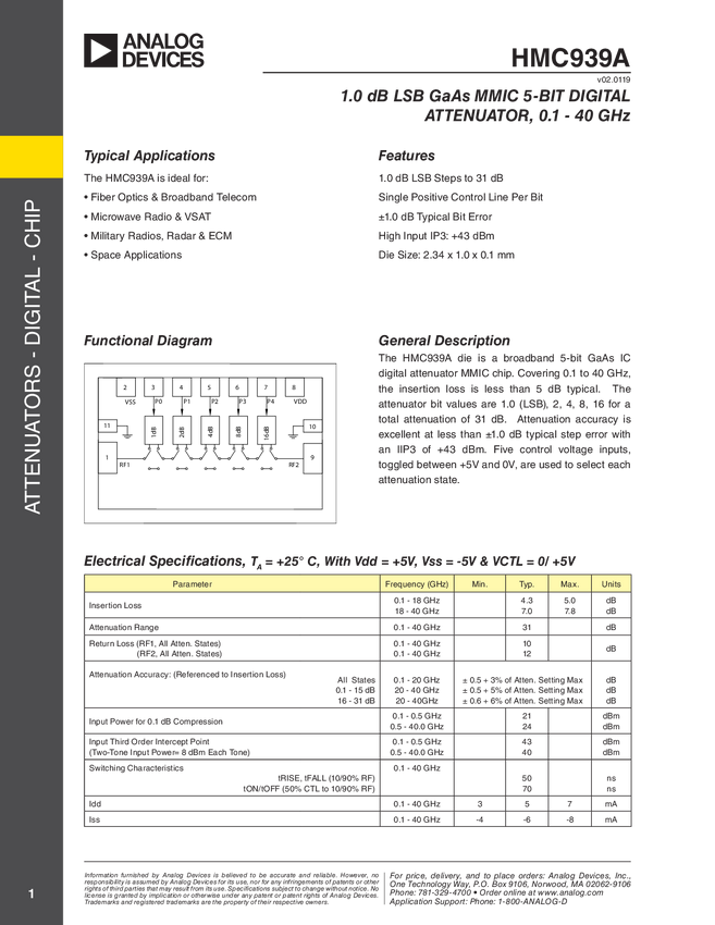 HMC939A-Die 1.0 dB LSB GaAs MMIC 5-Bit Digital Attenuator, 0.1 - 40 GHz