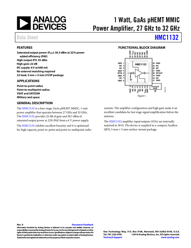 HMC1132LP5DE 1 Watt, GaAs pHEMT MMIC Power Amplifier, 27 GHz to 32 GHz