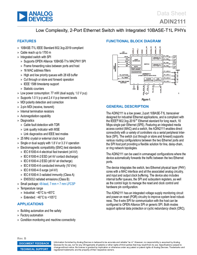 ADIN2111 Low Complexity, 2-Port Ethernet Switch with Integrated 10BASE-T1L PHYs