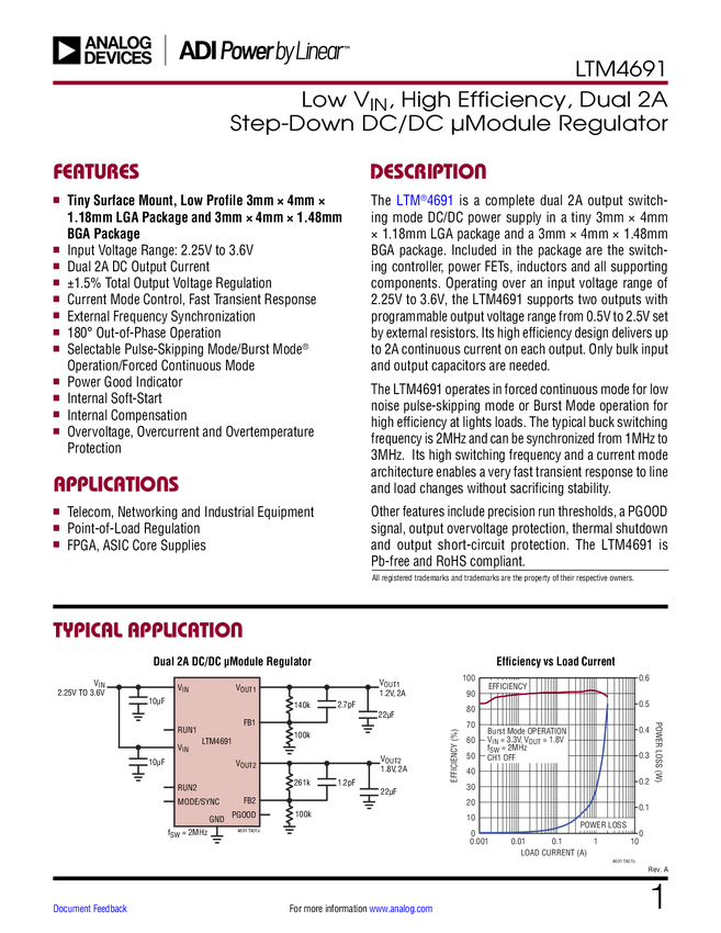LTM4691 Low V, High Efficiency, Dual 2A Step-Down DC/DC µModule Regulator