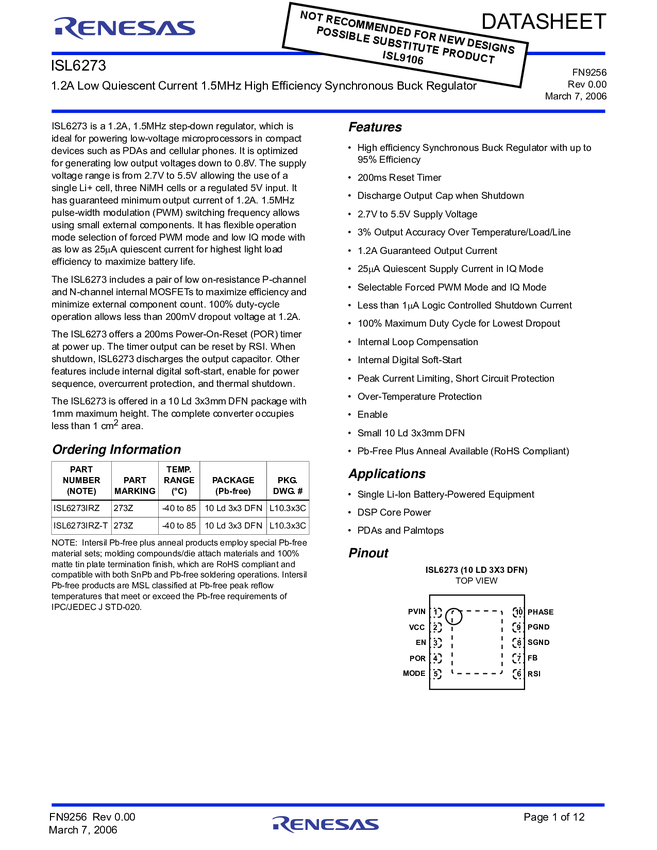 ISL6273 1.2A Low Quiescent Current 1.6MHz High Efficiency Synchronous Buck Regulato...