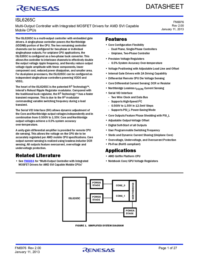 ISL6265C Multi-Output Controller with Integrated MOSFET Drivers for AMD SVI Capable...