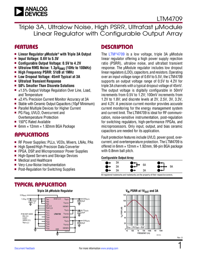 Triple 3A, Ultralow Noise, High PSRR, Ultrafast μModule Linear Regulator with Configurable Output Array