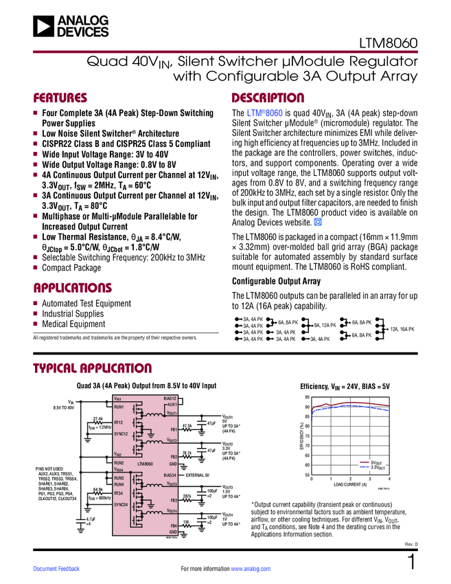 LTM8060 Quad 40V, Silent Switcher μModule Regulator with Configurable 3A Output Arr...