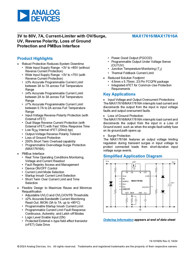 MAX17616A 3V to 80V, 7A, Current-Limiter with OV/Surge, UV, Reverse Polarity, Loss of...