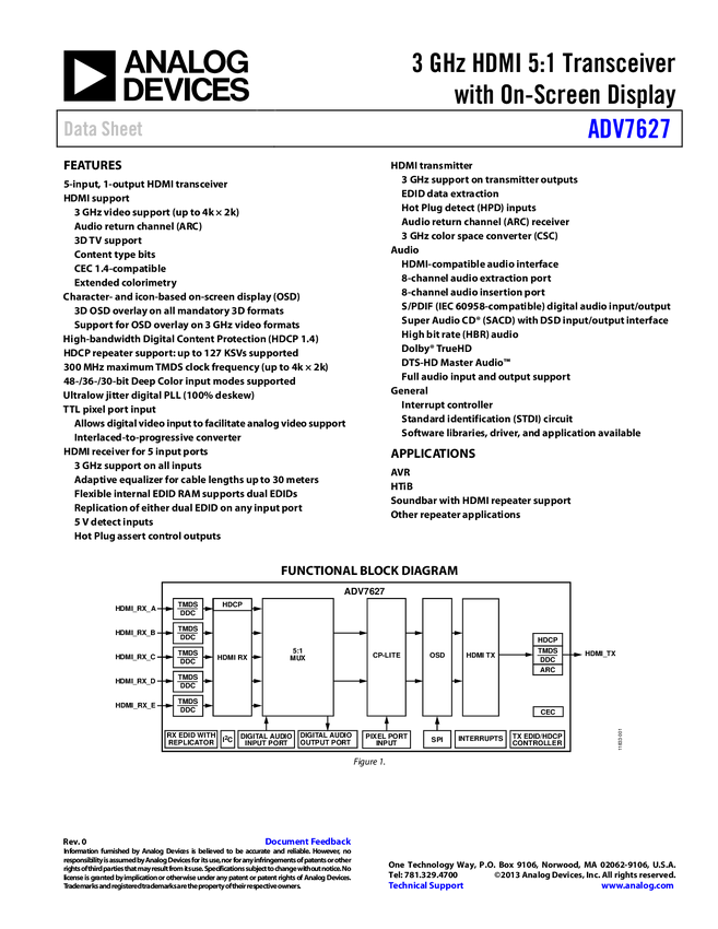 ADV7627 3GH HDMI 5:1 Transceiver with On-Screen Display