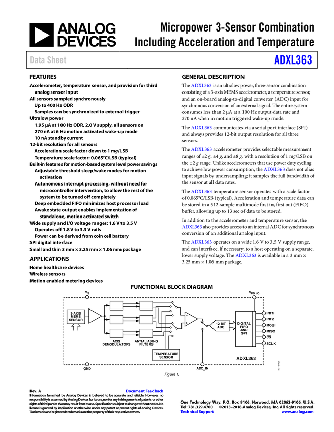 ADXL363 Micropower 3-Sensor Combination Including Acceleration and Temperature