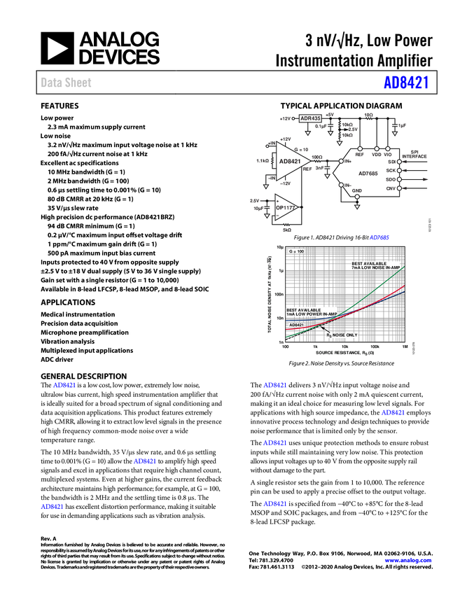 AD8421 3V /√H, Low Power Instrumentation Amplifier