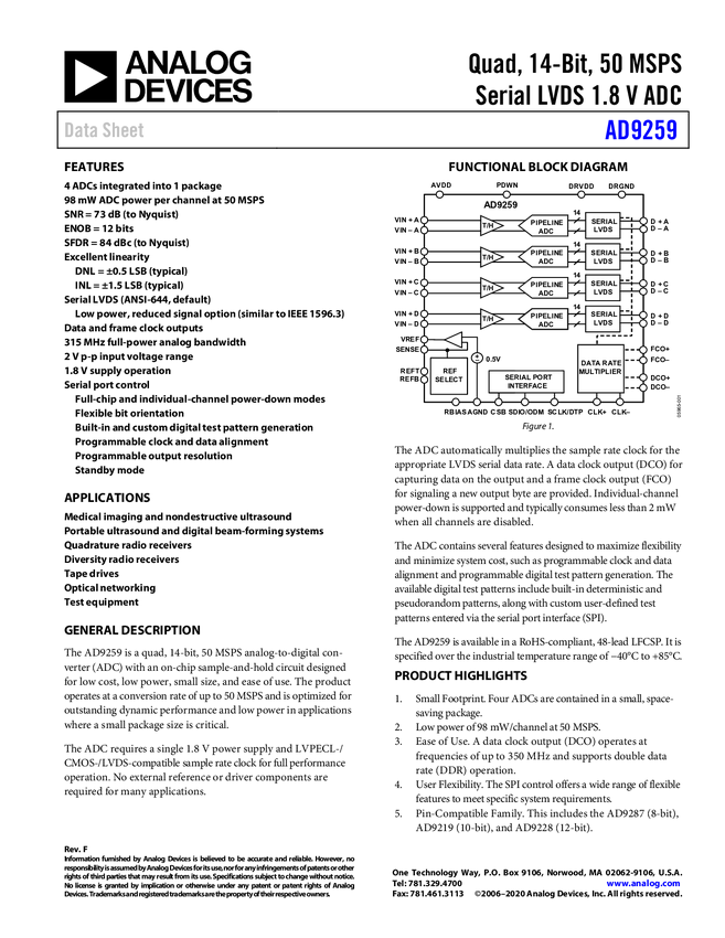 AD9259 Quad, 14-Bit, 50 MSPS Serial LVDS 1.8 V ADC