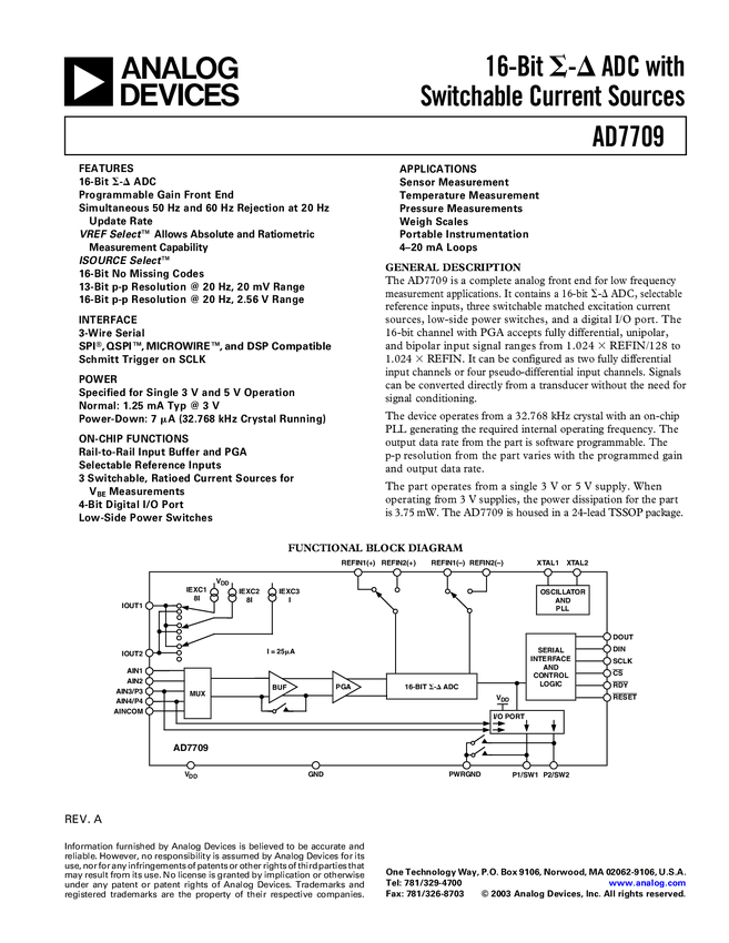 AD7709 16-Bit Sigma Delta ADC with Current Sources, Switchable Reference Inputs an...