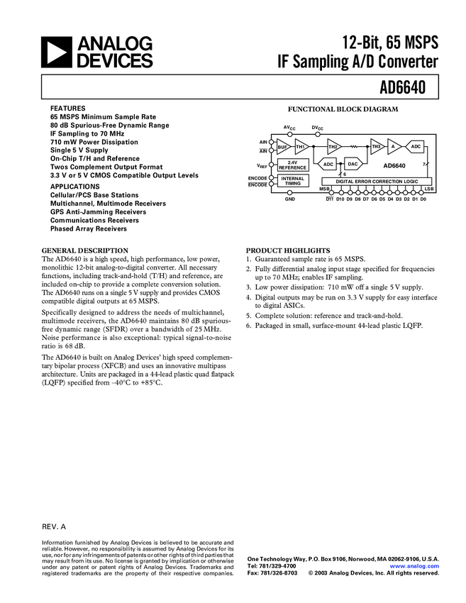 AD6640 12-Bit, 65 MSPS IF Sampling A/D Converter