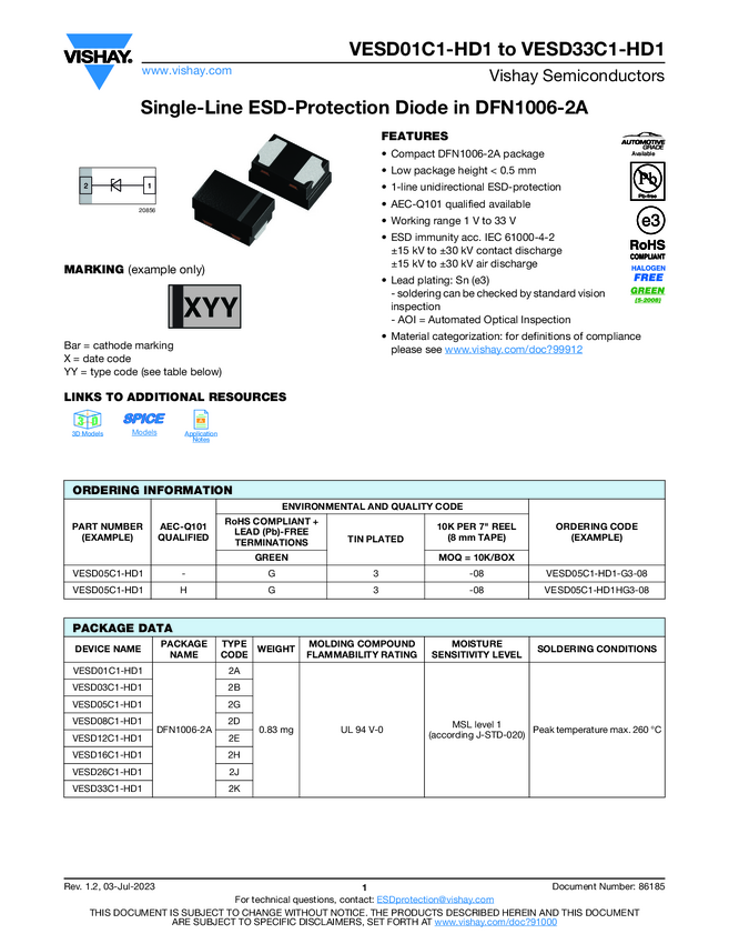 VESD01C1-HD1 to VESD33C1-HD1 Single-Line ESD-Protection Diode in DFN1006-2A