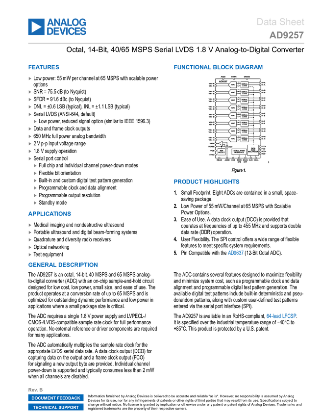 AD9257 Octal, 14-Bit, 40/65 MSPS Serial LVDS 1.8 V A/D Converter
